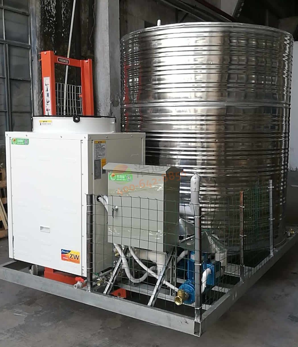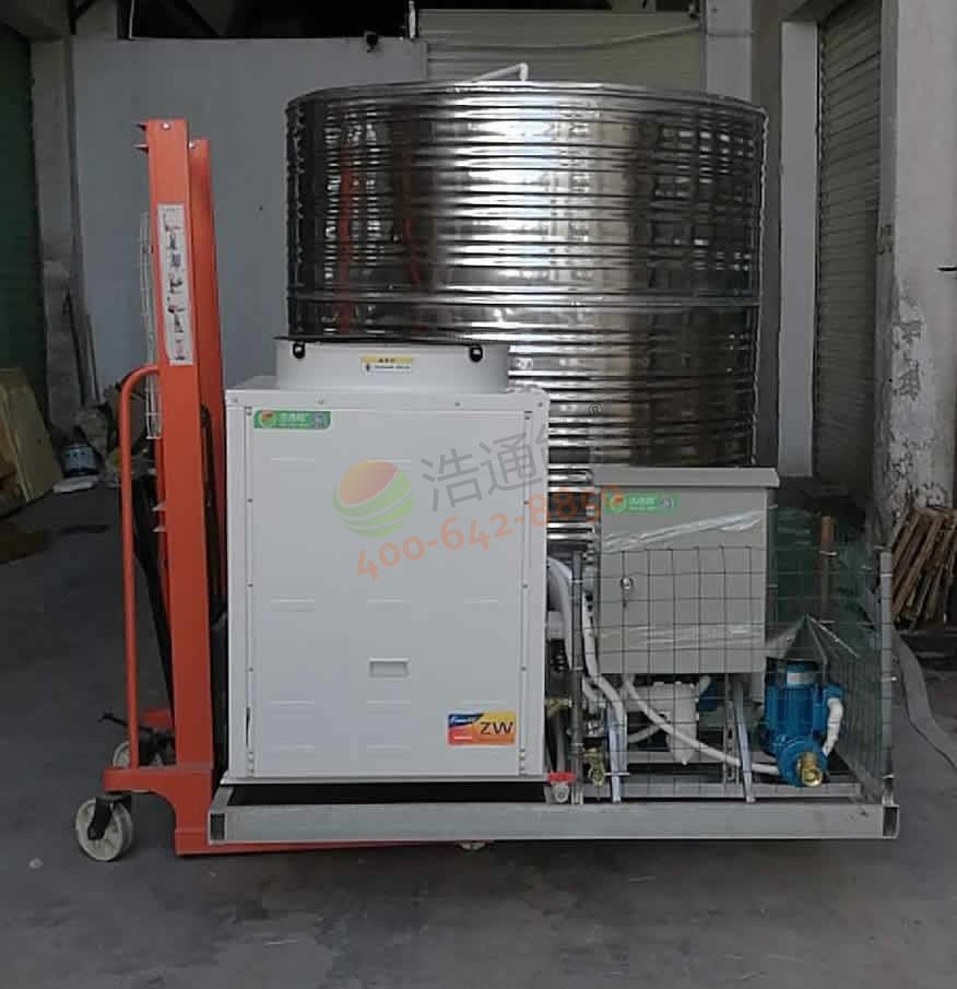 使用浩通能空氣能熱泵3匹主機一臺,配3噸不銹鋼保溫水箱1個及相關配套設施,為浩通能空氣能整體式熱水器設備一套